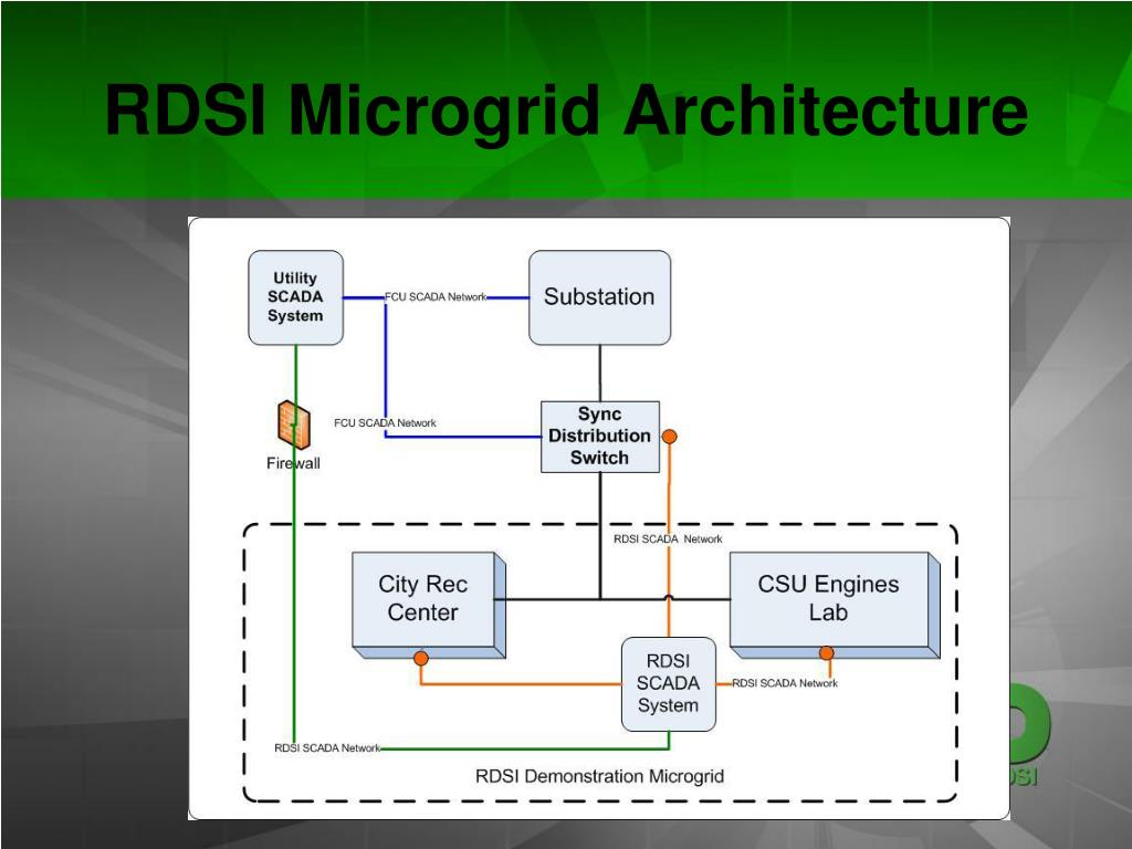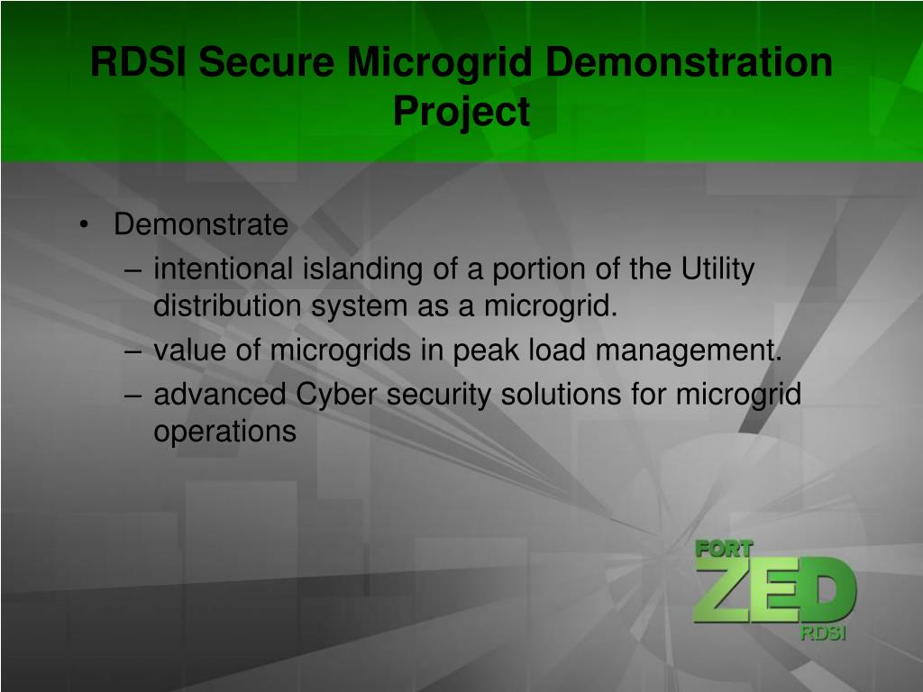 RDSI Secure MicrogridDemonstration Project • Demonstrate • intentional islanding of a portion of the Utility distribution system as a microgrid. • value of microgrids in peak load management. • advanced Cyber security solutions for microgridoperations