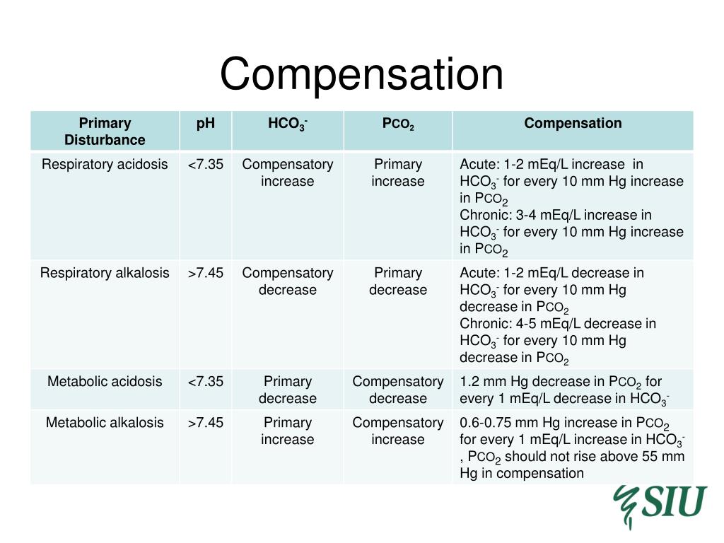 Description pH 7.18 PO2 61 mm Hg PCO2 58 mm Hg HCO3- 26 mEq/L 1-2 mEq/L increase in HCO3- for every 10 mm Hg increase in PCO2. PCO2 increase = 58-40 = 18 mm Hg. HCO3- increase predicted = (1-2) x (18/10) = 2-4 mEq/L add to 24 mEq/L (reference point) = 26-28 mEq/L