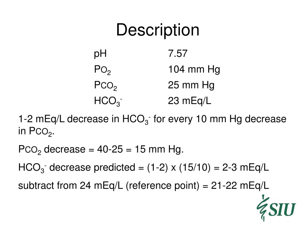 Description pH 7.57 PO2 104 mm Hg PCO2 25 mm Hg HCO3- 23 mEq/L 1-2 mEq/L decrease in HCO3- for every 10 mm Hg decrease in PCO2. PCO2 decrease = 40-25 = 15 mm Hg. HCO3- decrease predicted = (1-2) x (15/10) = 2-3 mEq/L subtract from 24 mEq/L (reference point) = 21-22 mEq/L