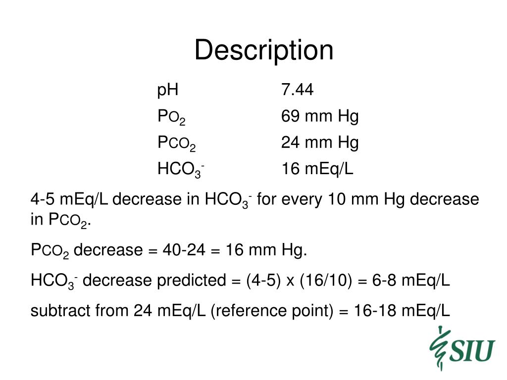 Description pH 7.44 PO2 69 mm Hg PCO2 24 mm Hg HCO3-16 mEq/L 4-5mEq/L decrease in HCO3- for every 10 mm Hg decrease in PCO2. PCO2 decrease = 40-24 = 16 mm Hg. HCO3- decrease predicted = (4-5) x (16/10) = 6-8mEq/L subtract from 24 mEq/L (reference point) = 16-18 mEq/L