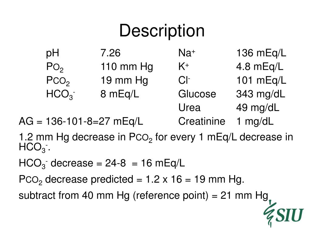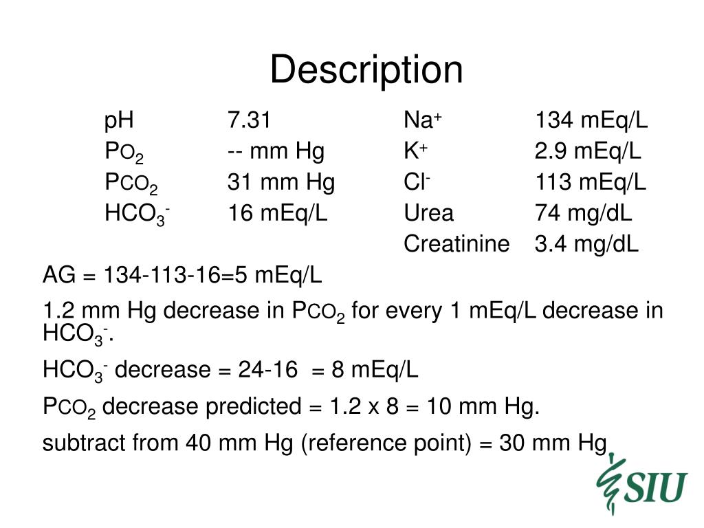 Description pH 7.31 Na+ 134 mEq/L PO2 -- mm Hg K+ 2.9 mEq/L PCO231 mm Hg Cl- 113 mEq/L HCO3-16 mEq/L Urea 74 mg/dL Creatinine3.4 mg/dL AG = 134-113-16=5 mEq/L 1.2 mm Hg decrease in PCO2 for every 1 mEq/L decrease in HCO3-. HCO3-decrease = 24-16 = 8mEq/L PCO2 decrease predicted = 1.2 x 8 = 10 mm Hg. subtract from 40 mm Hg (reference point) = 30 mm Hg
