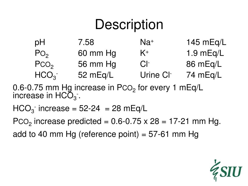 Description pH 7.58 Na+ 145 mEq/L PO2 60 mm Hg K+ 1.9 mEq/L PCO256 mm Hg Cl- 86 mEq/L HCO3-52 mEq/L Urine Cl- 74 mEq/L 0.6-0.75 mm Hg increase in PCO2 for every 1 mEq/L increase in HCO3-. HCO3-increase = 52-24 = 28 mEq/L PCO2 increase predicted = 0.6-0.75 x 28 = 17-21 mm Hg. add to 40 mm Hg (reference point) = 57-61 mm Hg