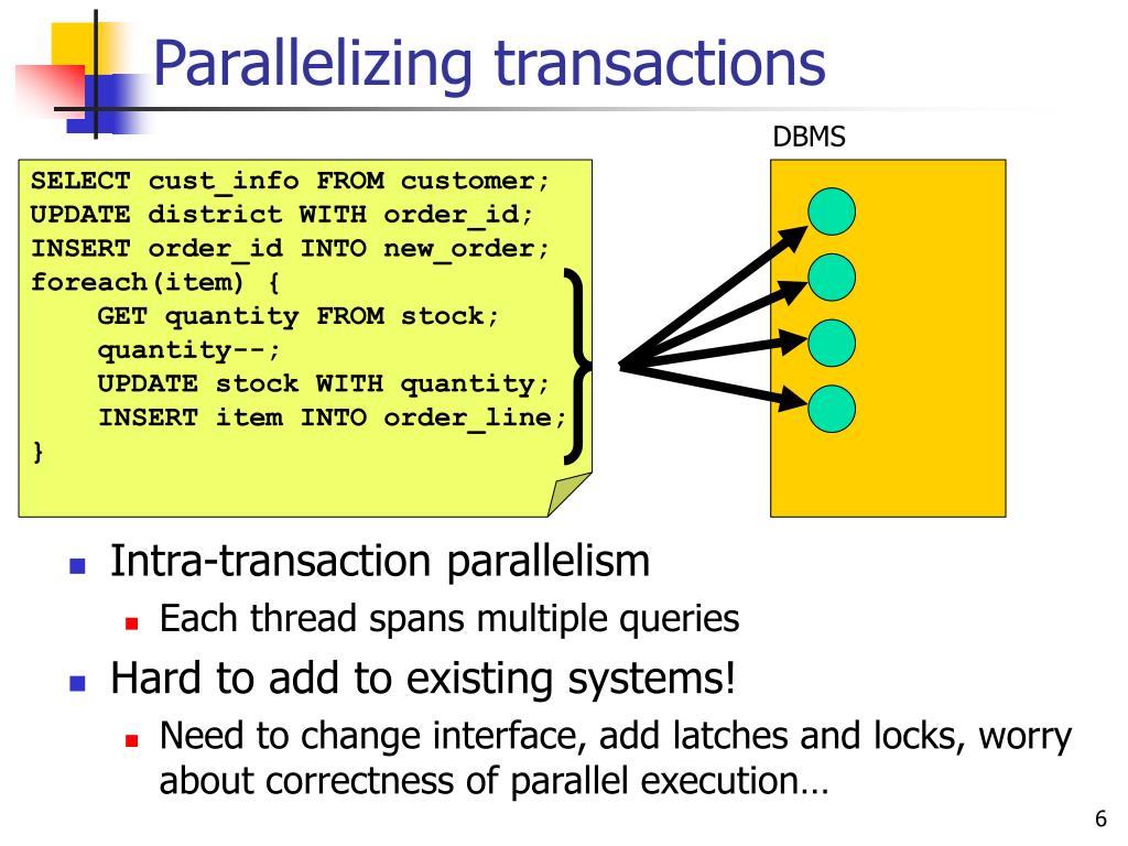 Parallelizing transactions DBMS SELECT cust_info FROM customer; UPDATE district WITH order_id; INSERT order_id INTO new_order; foreach(item) { GET quantity FROM stock; quantity--; UPDATE stock WITH quantity; INSERT item INTO order_line; } • Intra-transaction parallelism • Each thread spans multiple queries • Hard to add to existing systems! • Need to change interface, add latches and locks, worry about correctness of parallel execution…