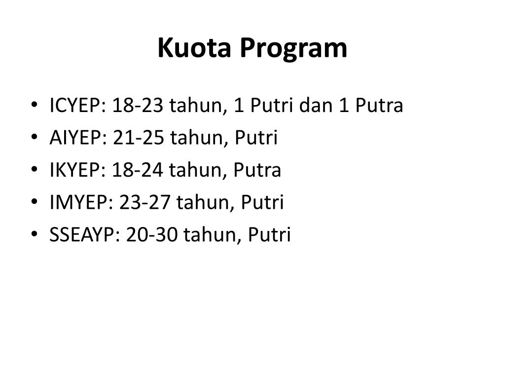 Kuota Program • ICYEP: 18-23tahun, 1 Putridan 1 Putra • AIYEP: 21-25 tahun, Putri • IKYEP: 18-24 tahun, Putra • IMYEP: 23-27 tahun, Putri • SSEAYP: 20-30 tahun, Putri