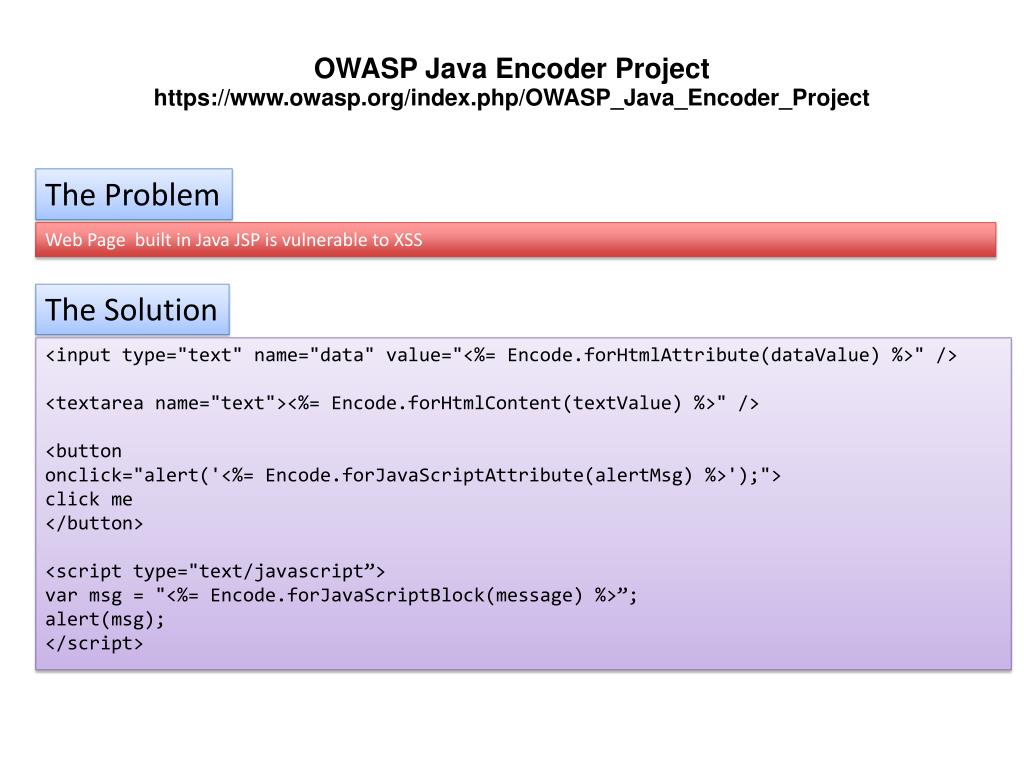 OWASP Java Encoder Projecthttps://www.owasp.org/index.php/OWASP_Java_Encoder_Project The Problem Web Page built in Java JSP is vulnerable to XSS The Solution <input type="text" name="data" value="<%= Encode.forHtmlAttribute(dataValue) %>" /> <textarea name="text"><%= Encode.forHtmlContent(textValue) %>" /> <button onclick="alert('<%= Encode.forJavaScriptAttribute(alertMsg) %>');"> click me </button> <script type="text/javascript”> var msg = "<%= Encode.forJavaScriptBlock(message) %>”; alert(msg); </script>