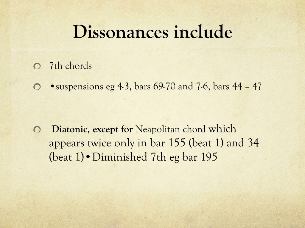 Dissonances include • 7th chords • •suspensions eg 4-3, bars 69-70 and 7-6, bars 44 – 47 • Diatonic, except for Neapolitan chord which appears twice only in bar 155 (beat 1) and 34 (beat 1)•Diminished 7th eg bar 195