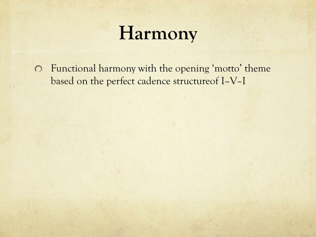 Harmony • Functional harmony with the opening ‘motto’ theme based on the perfect cadence structureof I–V–I