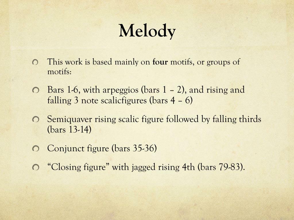 Melody • This work is based mainly on four motifs, or groups of motifs: • Bars 1-6, with arpeggios (bars 1 – 2), and rising and falling 3 note scalicfigures (bars 4 – 6) • Semiquaver rising scalic figure followed by falling thirds (bars 13-14) • Conjunct figure (bars 35-36) • “Closing figure” with jagged rising 4th (bars 79-83).