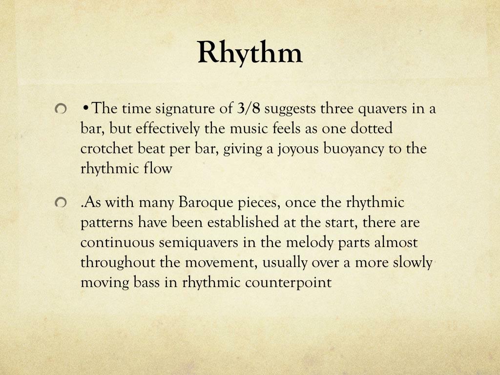 Rhythm • •The time signature of 3/8 suggests three quavers in a bar, but effectively the music feels as one dotted crotchet beat per bar, giving a joyous buoyancy to the rhythmic flow • .As with many Baroque pieces, once the rhythmic patterns have been established at the start, there are continuous semiquavers in the melody parts almost throughout the movement, usually over a more slowly moving bass in rhythmic counterpoint