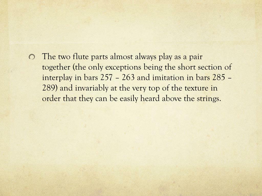 The two flute parts almost always play as a pair together (the only exceptions being the short section of interplay in bars 257 – 263 and imitation in bars 285 – 289) and invariably at the very top of the texture in order that they can be easily heard above the strings.