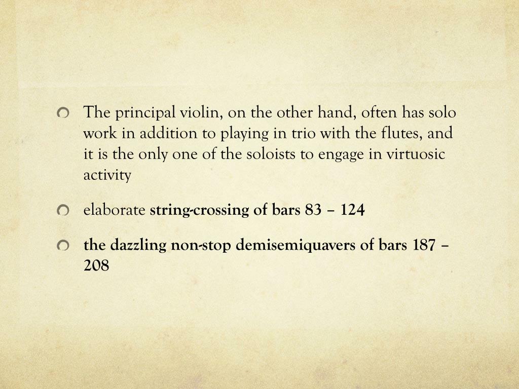 The principal violin, on the other hand, often has solo work in addition to playing in trio with the flutes, and it is the only one of the soloists to engage in virtuosic activity • elaborate string-crossing of bars 83 – 124 • the dazzling non-stop demisemiquavers of bars 187 – 208