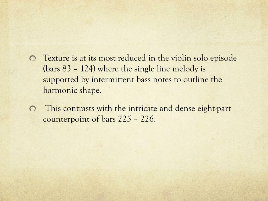Texture is at its most reduced in the violin solo episode (bars 83 – 124) where the single line melody is supported by intermittent bass notes to outline the harmonic shape. • This contrasts with the intricate and dense eight-part counterpoint of bars 225 – 226.