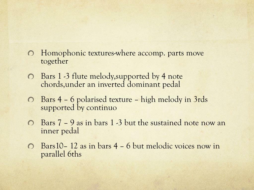 Homophonic textures-where accomp. parts move together • Bars 1 -3 flute melody,supported by 4 note chords,under an inverted dominant pedal • Bars 4 – 6 polarised texture – high melody in 3rds supported by continuo • Bars 7 – 9 as in bars 1 -3 but the sustained note now an inner pedal • Bars10– 12 as in bars 4 – 6 but melodic voices now in parallel 6ths