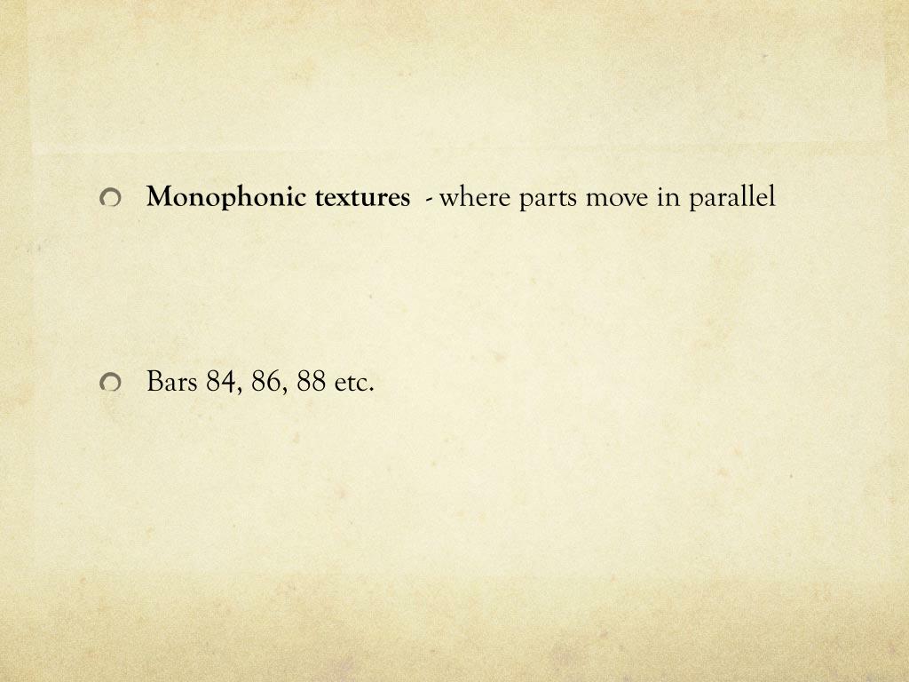 Monophonic textures - where parts move in parallel • Bars 84, 86, 88 etc.