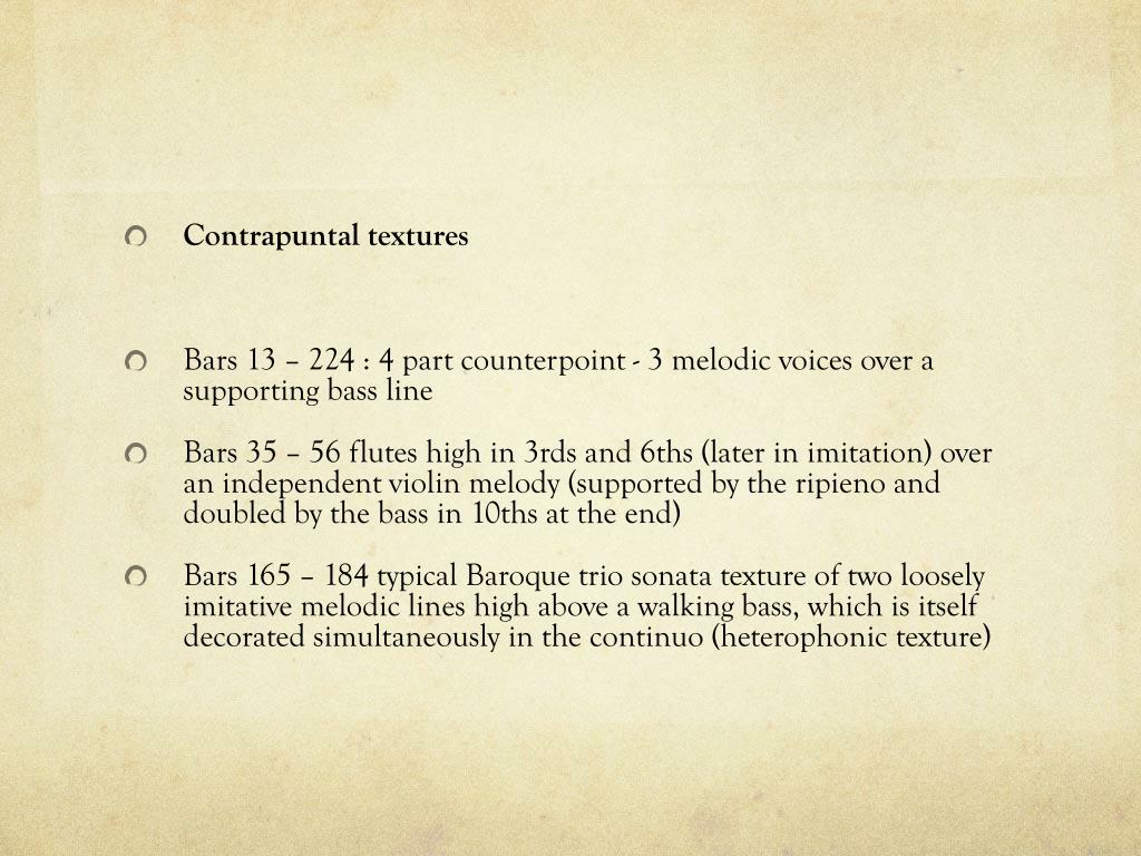 Contrapuntal textures • Bars 13 – 224 : 4 part counterpoint - 3 melodic voices over a supporting bass line • Bars 35 – 56 flutes high in 3rds and 6ths (later in imitation) over an independent violin melody (supported by the ripieno and doubled by the bass in 10ths at the end) • Bars 165 – 184 typical Baroque trio sonata texture of two loosely imitative melodic lines high above a walking bass, which is itself decorated simultaneously in the continuo (heterophonic texture)