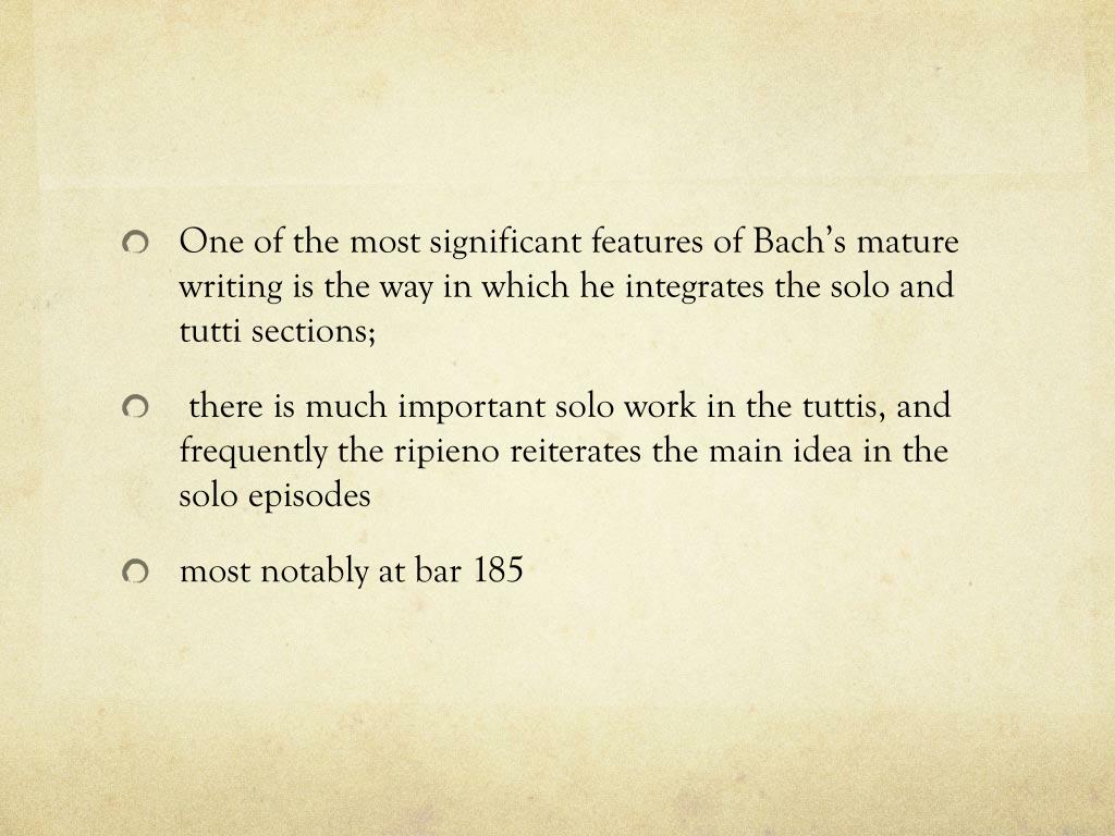 One of the most significant features of Bach’s mature writing is the way in which he integrates the solo and tutti sections; • there is much important solo work in the tuttis, and frequently the ripieno reiterates the main idea in the solo episodes • most notably at bar 185