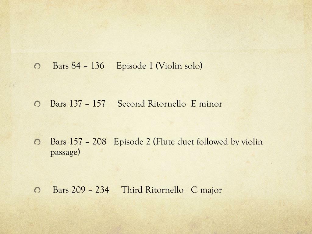 Bars 84 – 136 Episode 1 (Violin solo) • Bars 137 – 157 Second Ritornello E minor • Bars 157 – 208 Episode 2 (Flute duet followed by violin passage) • Bars 209 – 234 Third Ritornello C major