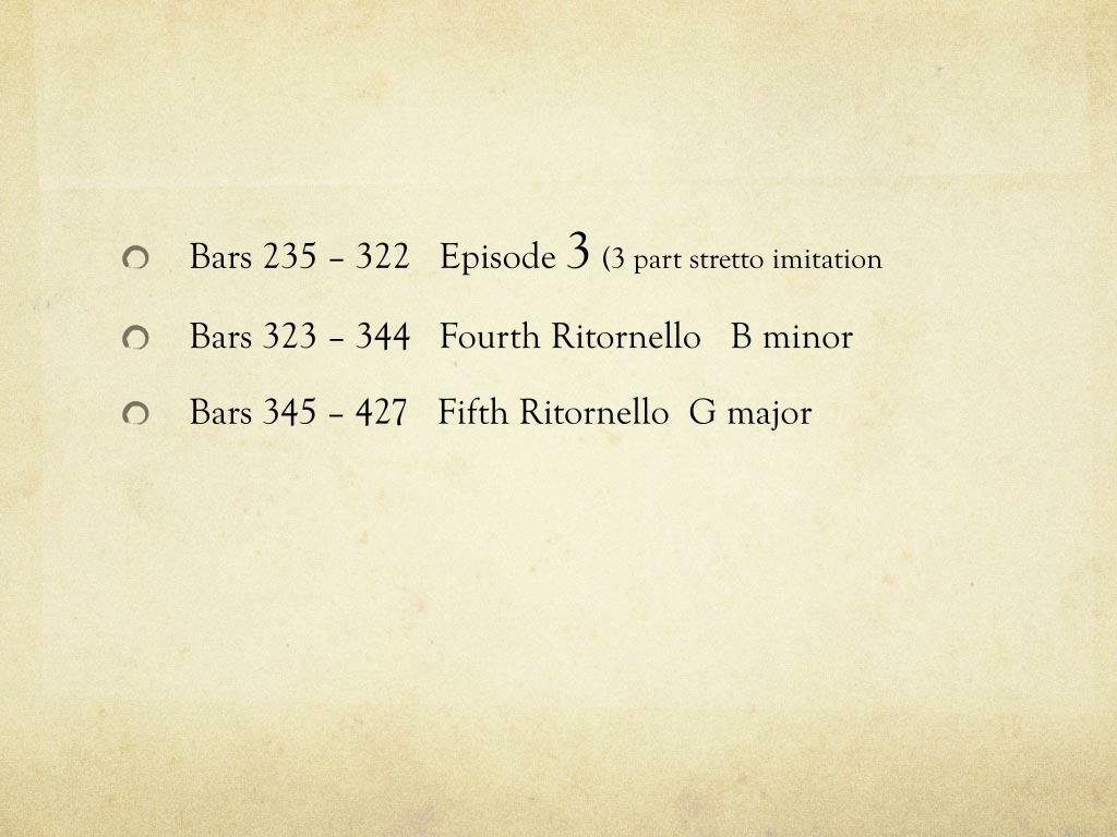 Bars 235 – 322 Episode 3(3 part stretto imitation • Bars 323 – 344 Fourth Ritornello B minor • Bars 345 – 427 Fifth Ritornello G major