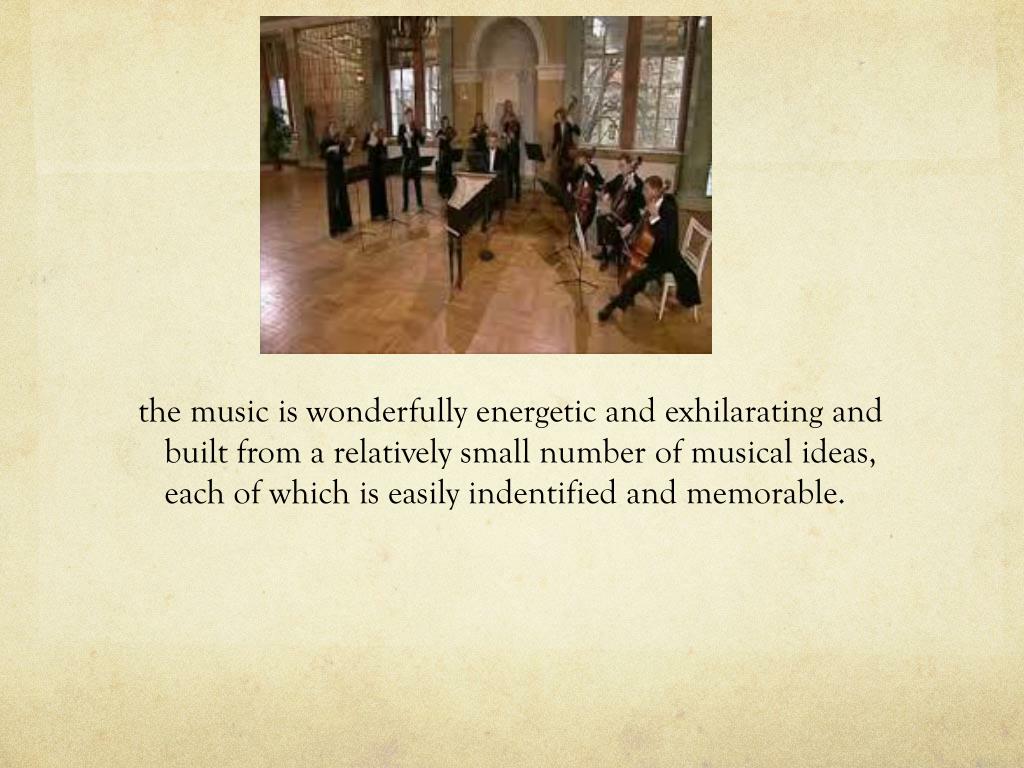 BRANDENBURG CONCERTO NO.4 IN G. the music is wonderfully energetic and exhilarating and built from a relatively small number of musical ideas, each of which is easily indentified and memorable. The music is an example (arguably one of the finest) of a concerto grosso ,