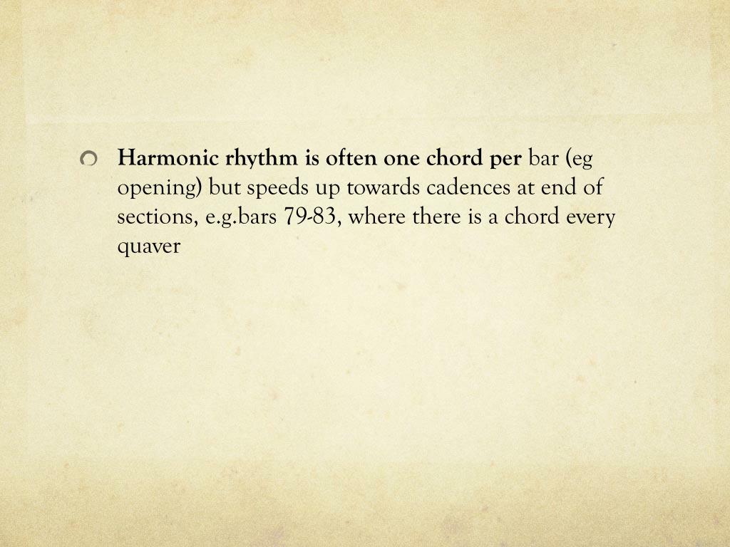 Harmonic rhythm is often one chord per bar (eg opening) but speeds up towards cadences at end of sections, e.g.bars 79-83, where there is a chord every quaver