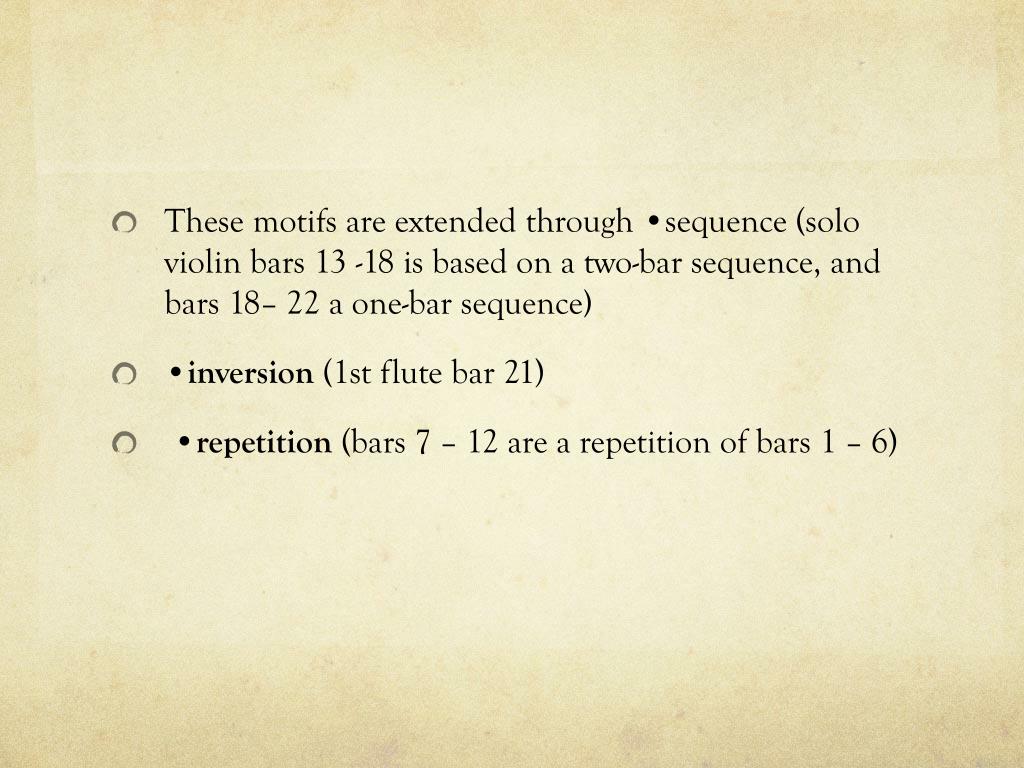 These motifs are extended through •sequence (solo violin bars 13 -18 is based on a two-bar sequence, and bars 18– 22 a one-bar sequence) • •inversion (1st flute bar 21) • •repetition (bars 7 – 12 are a repetition of bars 1 – 6)
