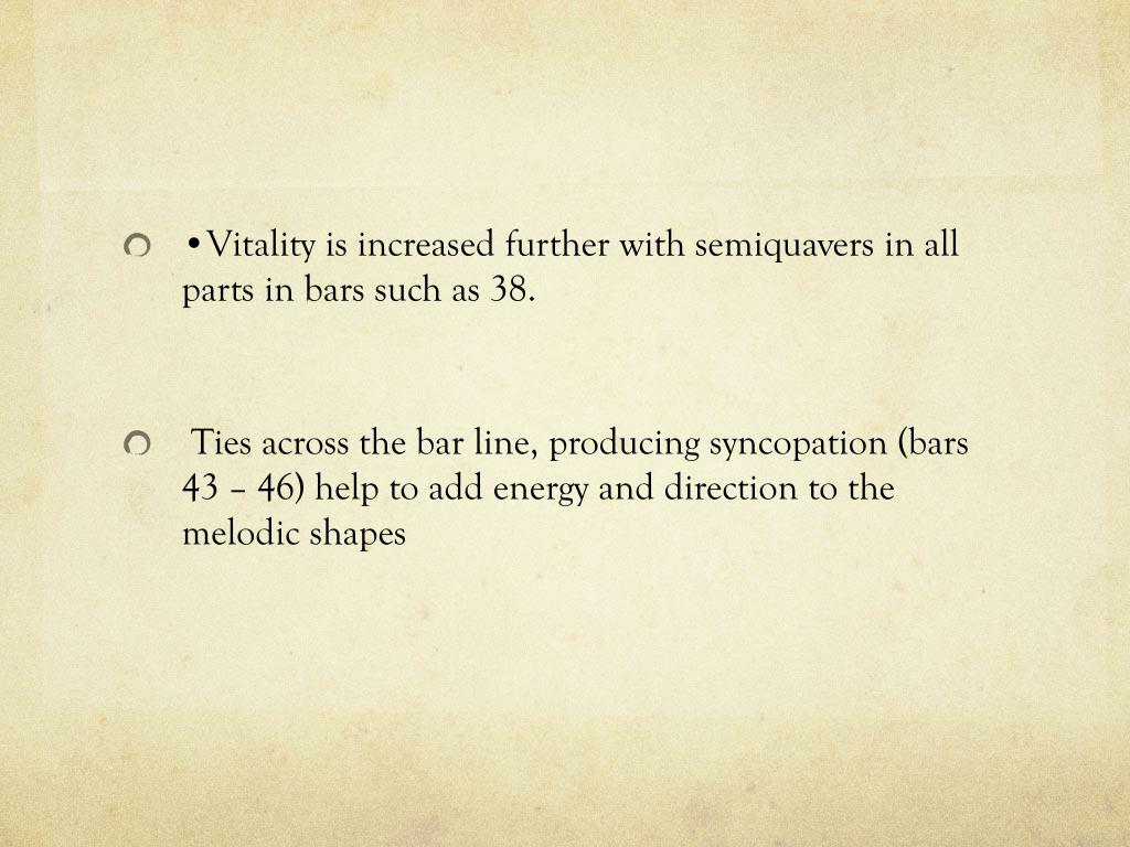 •Vitality is increased further with semiquavers in all parts in bars such as 38. • Ties across the bar line, producing syncopation (bars 43 – 46) help to add energy and direction to the melodic shapes