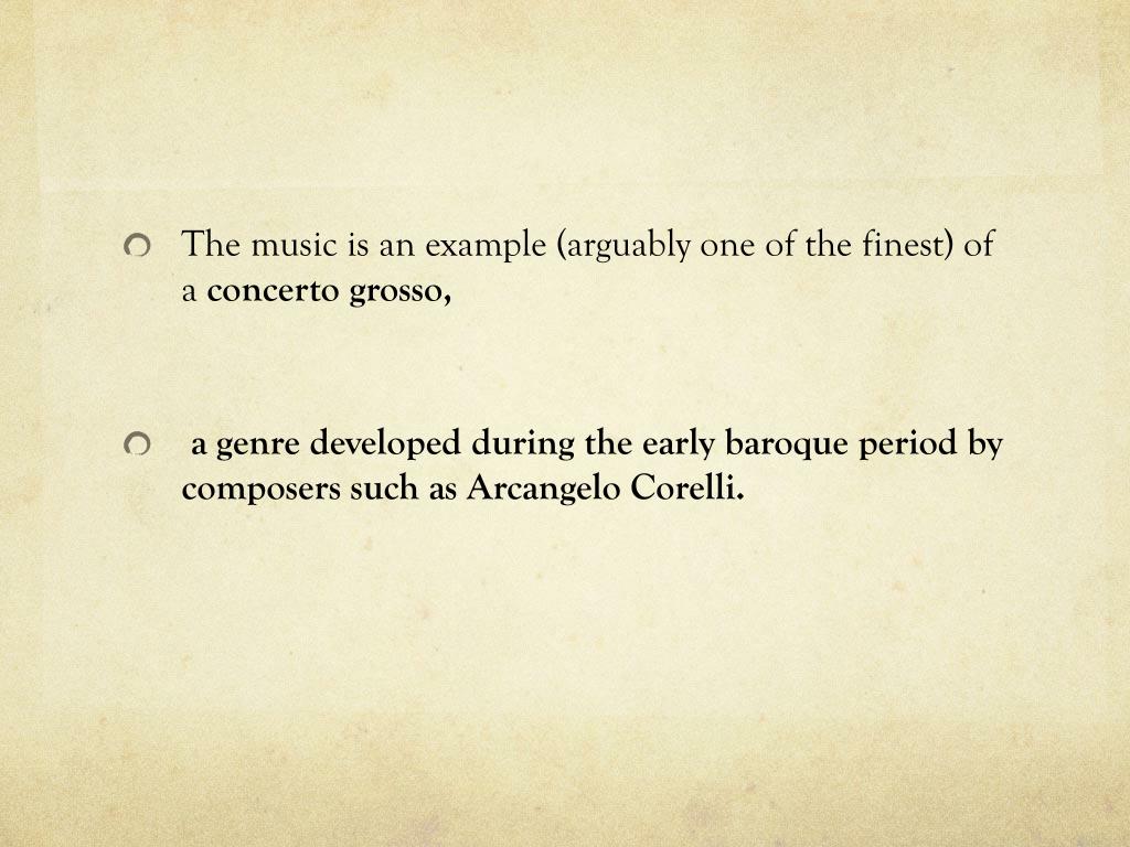The music is an example (arguably one of the finest) of a concerto grosso, • a genre developed during the early baroque period by composers such as Arcangelo Corelli.