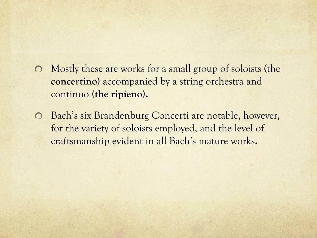 Mostly these are works for a small group of soloists (the concertino) accompanied by a string orchestra and continuo (the ripieno). • Bach’s six Brandenburg Concerti are notable, however, for the variety of soloists employed, and the level of craftsmanship evident in all Bach’s mature works.