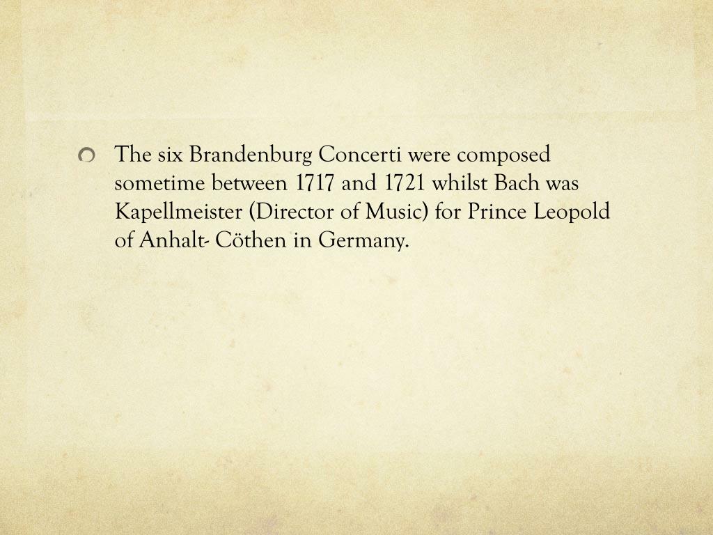 The six Brandenburg Concerti were composed sometime between 1717 and 1721 whilst Bach was Kapellmeister (Director of Music) for Prince Leopold of Anhalt- Cöthen in Germany.