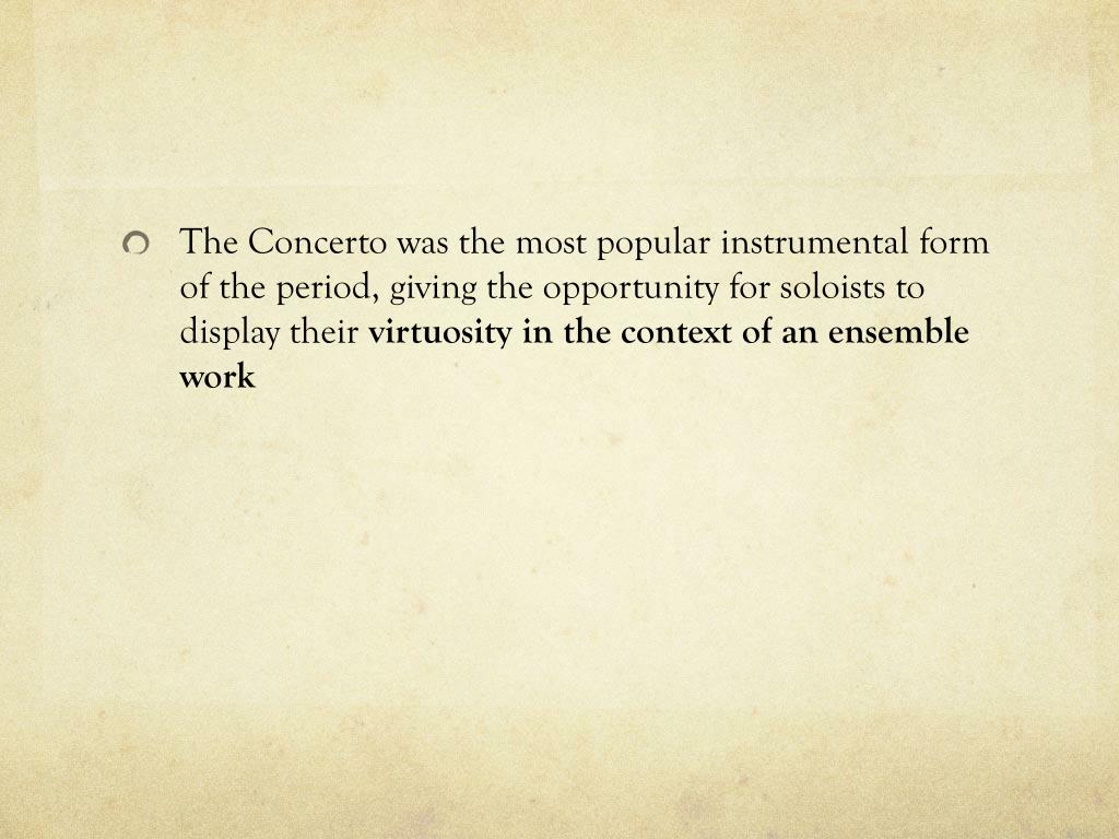 The Concerto was the most popular instrumental form of the period, giving the opportunity for soloists to display their virtuosity in the context of an ensemble work