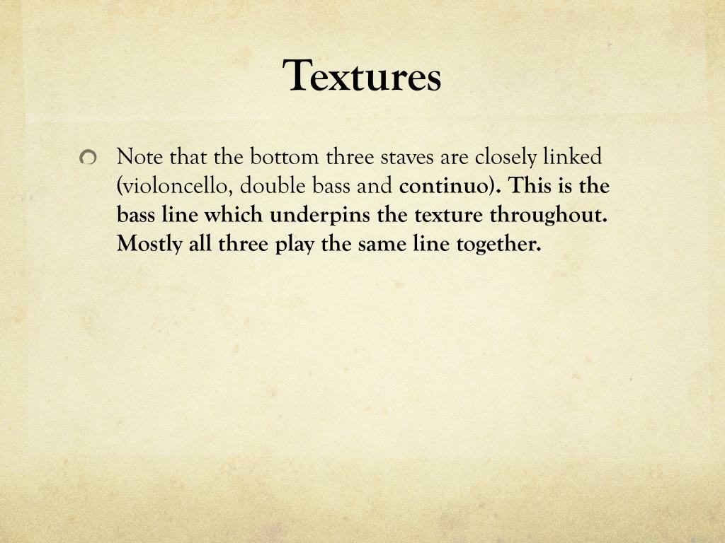 Textures • Note that the bottom three staves are closely linked (violoncello, double bass and continuo). This is the bass line which underpins the texture throughout. Mostly all three play the same line together.