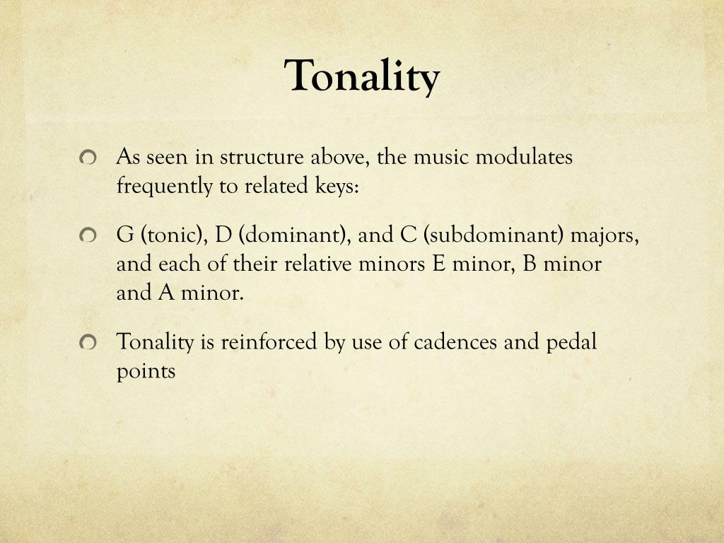 Tonality • As seen in structure above, the music modulates frequently to related keys: • G (tonic), D (dominant), and C (subdominant) majors, and each of their relative minors E minor, B minor and A minor. • Tonality is reinforced by use of cadences and pedal points