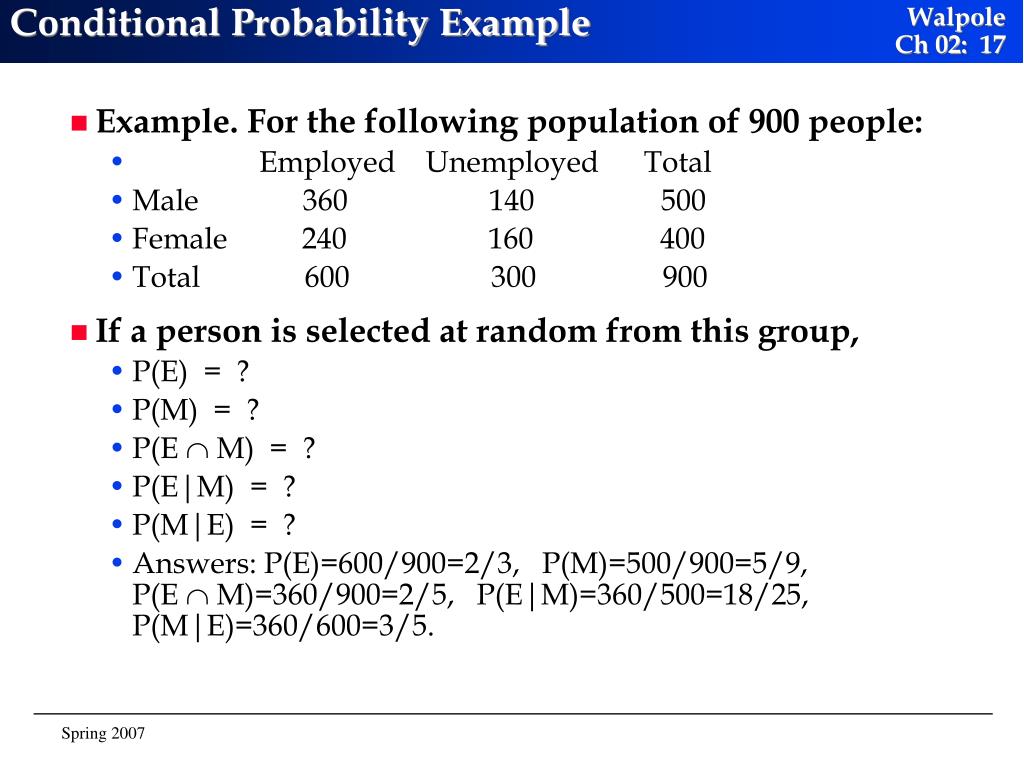 Conditional Probability Example • Example. For the following population of 900 people: • Employed Unemployed Total • Male 360 140 500 • Female 240 160 400 • Total 600 300 900 • If a person is selected at random from this group, • P(E) = ? • P(M) = ? • P(E M) = ? • P(E|M) = ? • P(M|E) = ? • Answers: P(E)=600/900=2/3, P(M)=500/900=5/9, P(E M)=360/900=2/5, P(E|M)=360/500=18/25, P(M|E)=360/600=3/5.