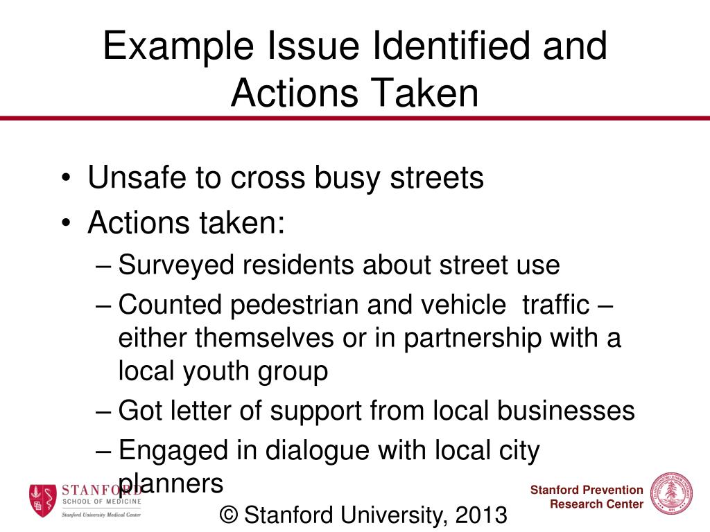 Example Issue Identified and Actions Taken • Unsafe to cross busy streets • Actions taken: • Surveyed residents about street use • Counted pedestrian and vehicle traffic – either themselves or in partnership with a local youth group • Got letter of support from local businesses • Engaged in dialogue with local city planners