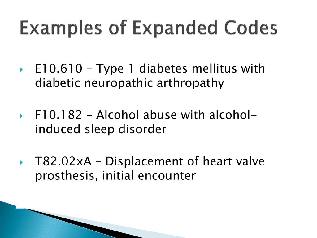 Examples of Expanded Codes • E10.610 – Type 1 diabetes mellitus with diabetic neuropathic arthropathy • F10.182 – Alcohol abuse with alcohol-induced sleep disorder • T82.02xA – Displacement of heart valve prosthesis, initial encounter