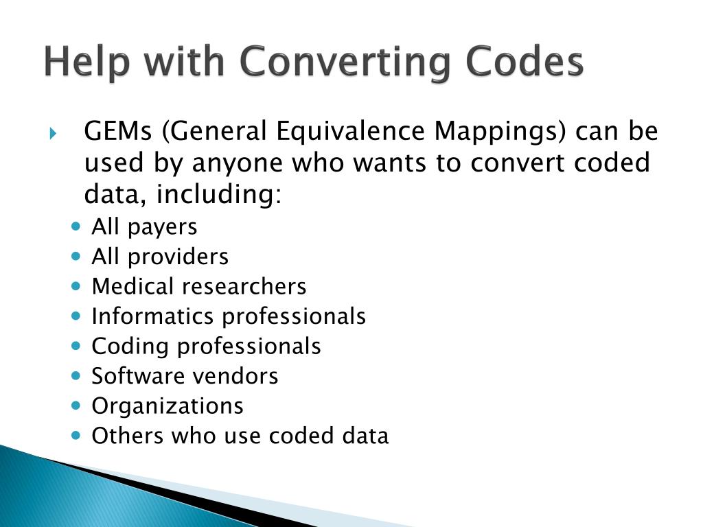 Help with Converting Codes • GEMs (General Equivalence Mappings) can be used by anyone who wants to convert coded data, including: • All payers • All providers • Medical researchers • Informatics professionals • Coding professionals • Software vendors • Organizations • Others who use coded data