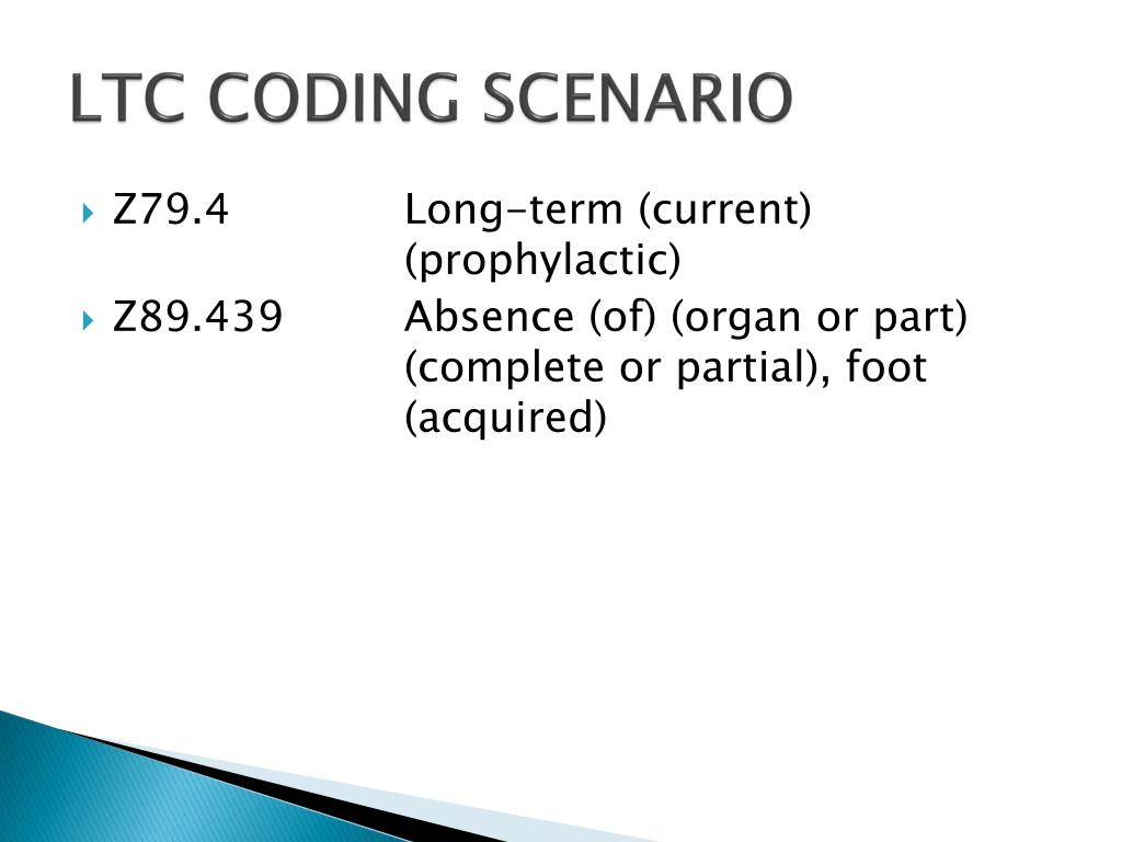 LTC CODING SCENARIO • Z79.4 Long-term (current) (prophylactic) • Z89.439 Absence (of) (organ or part) (complete or partial), foot (acquired)