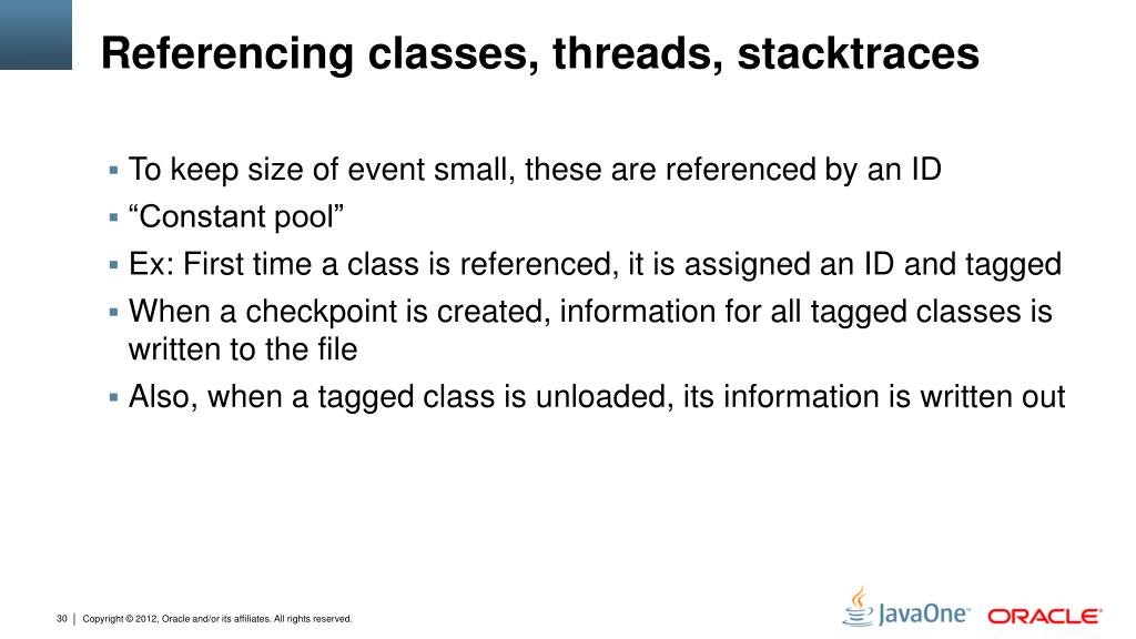 Referencing classes, threads, stacktraces • To keep size of event small, these are referenced by an ID • “Constant pool” • Ex: First time a class is referenced, it is assigned an ID and tagged • When a checkpoint is created, information for all tagged classes is written to the file • Also, when a tagged class is unloaded, its information is written out