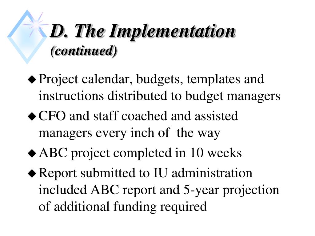 D. The Implementation (continued) • Project calendar, budgets, templates and instructions distributed to budget managers • CFO and staff coached and assisted managers every inch of the way • ABC project completed in 10 weeks • Report submitted to IU administration included ABC report and 5-year projection of additional funding required
