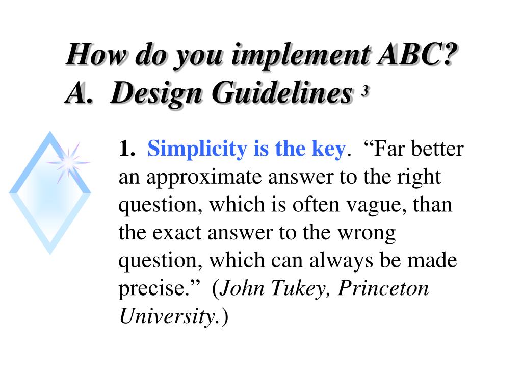 How do you implement ABC?A. Design Guidelines 3 1. Simplicity is the key. “Far better an approximate answer to the right question, which is often vague, than the exact answer to the wrong question, which can always be made precise.” (John Tukey, Princeton University.)
