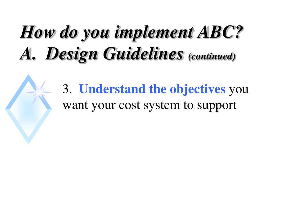 How do you implement ABC?A. Design Guidelines (continued) 3. Understand the objectives you want your cost system to support