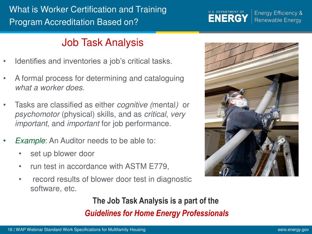 What is Worker Certification and Training Program Accreditation Based on? • Job Task Analysis • Identifies and inventories a job’s critical tasks. • A formal process for determining and cataloguing what a worker does. • Tasks are classified as either cognitive (mental) or psychomotor (physical) skills, and as critical, very important, and important for job performance. • Example: An Auditor needs to be able to: • set up blower door • run test in accordance with ASTM E779, • record results of blower door test in diagnostic software, etc. The Job Task Analysis is a part of the Guidelines for Home Energy Professionals
