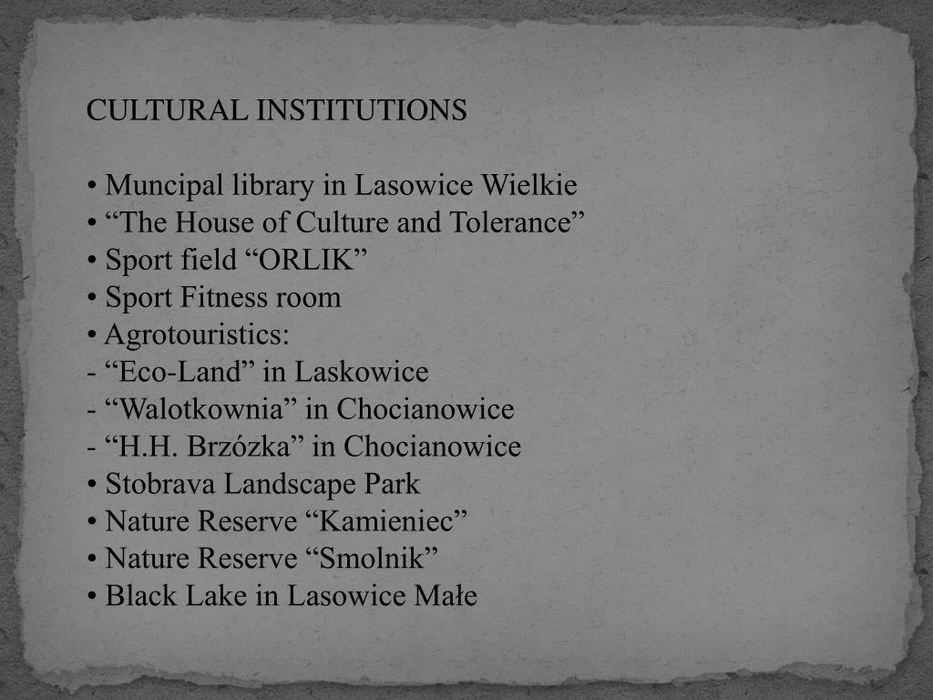 CULTURAL INSTITUTIONS • Muncipal library in Lasowice Wielkie • “The House of Culture and Tolerance” • Sport field “ORLIK” • Sport Fitness room • Agrotouristics: - “Eco-Land” in Laskowice - “Walotkownia” in Chocianowice - “H.H. Brzózka” in Chocianowice • Stobrava Landscape Park • Nature Reserve “Kamieniec” • Nature Reserve “Smolnik” • Black Lake in Lasowice Małe