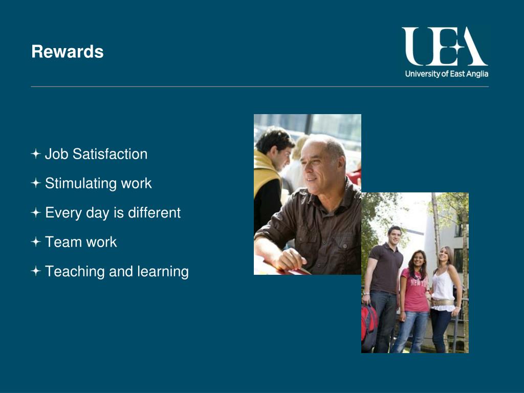 Rewards • Job Satisfaction • Stimulating work • Every day is different • Team work • Teaching and learning