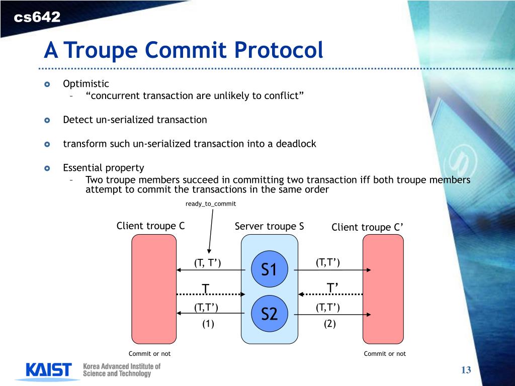 Replicated Transactions • The Transaction mechanism • Guaranteeing serializability & atomicity • Conventional transaction • The permanence of committed updates • Crash recovery algorithm • Correctness condition for conventional transactions • serializability • Troupe consistency must also be preserved • Existing concurrency control algorithm for replicated DB • Require communication among replicas • Can’t be used in troupe model • One well-known multiple-copy concurrency control algorithm • two-phase locking with unanimous update 12
