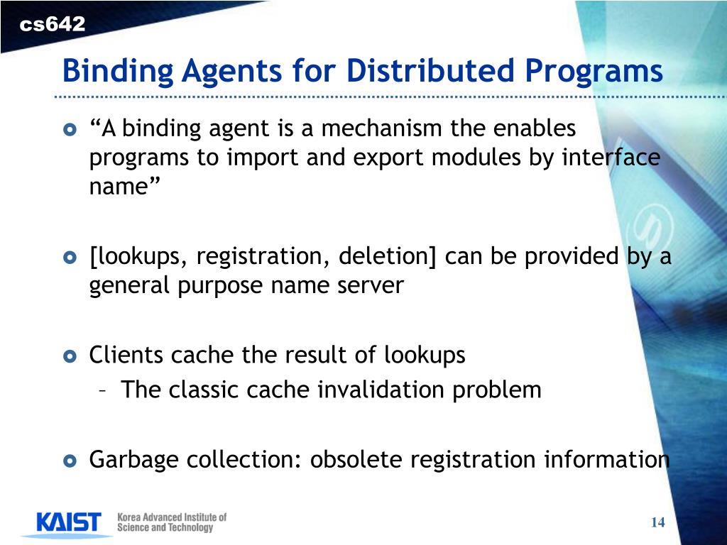 Binding Agents for Distributed Programs • “A binding agent is a mechanism the enables programs to import and export modules by interface name” • [lookups, registration, deletion] can be provided by a general purpose name server • Clients cache the result of lookups • The classic cache invalidation problem • Garbage collection: obsolete registration information 14