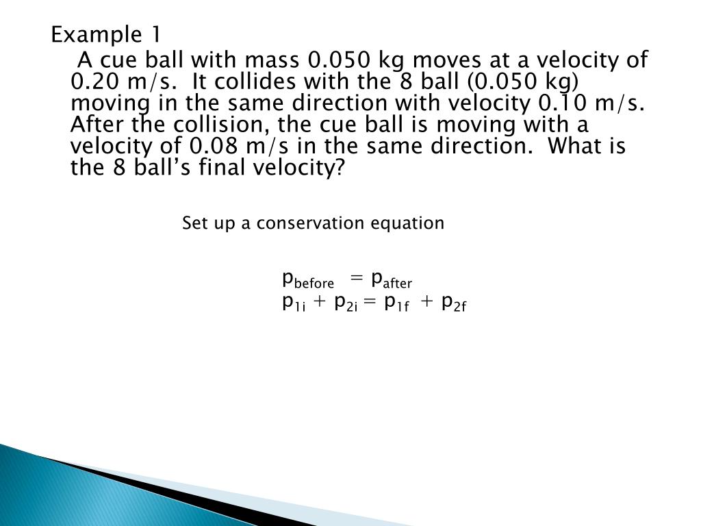 Example 1 A cue ball with mass 0.050 kg moves at a velocity of 0.20 m/s. It collides with the 8 ball (0.050 kg) moving in the same direction with velocity 0.10 m/s. After the collision, the cue ball is moving with a velocity of 0.08 m/s in the same direction. What is the 8 ball’s final velocity? Set up a conservation equation pbefore = pafter p1i + p2i = p1f+ p2f