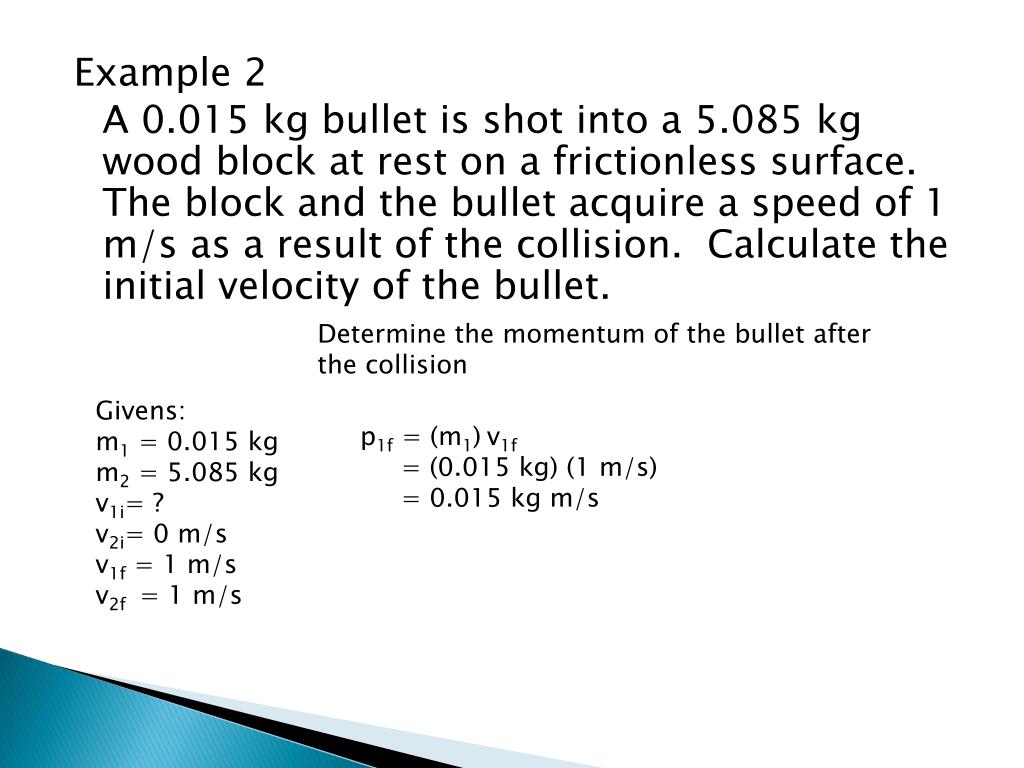 Example 2 A 0.015 kg bullet is shot into a 5.085 kg wood block at rest on a frictionless surface. The block and the bullet acquire a speed of 1 m/s as a result of the collision. Calculate the initial velocity of the bullet. Determine the initial velocity of the bullet p1i= m1v1i 5.1 kg m/s = 0.015 kg(v1i) v1i = 340 m/s