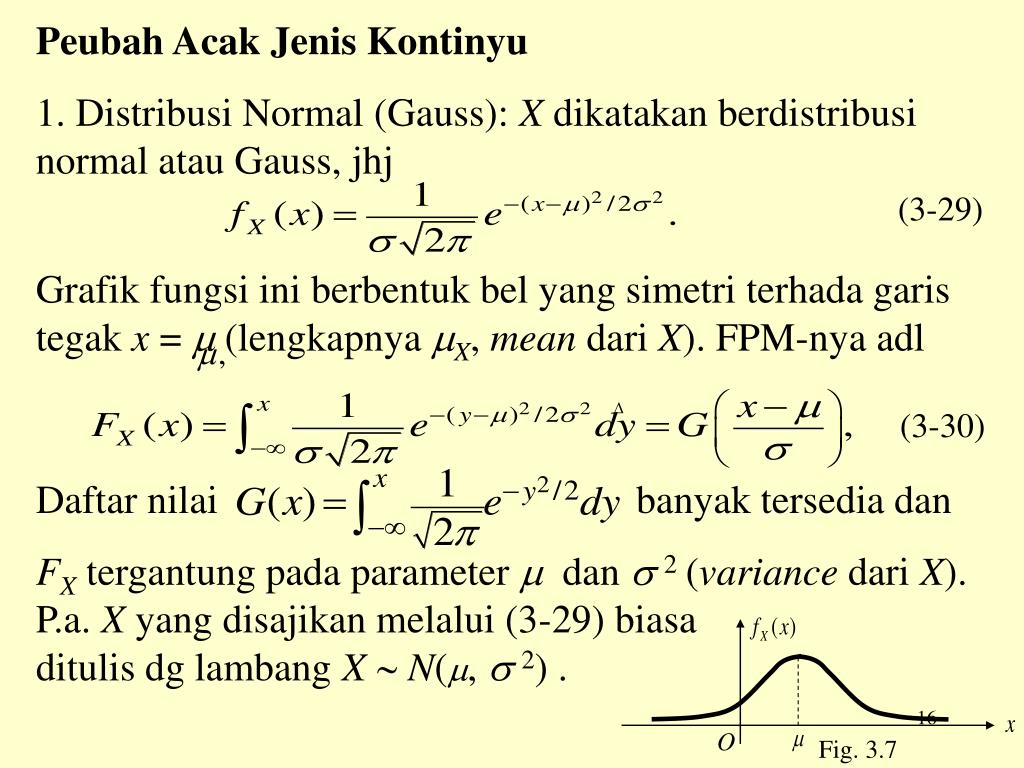 O Fig. 3.7 Peubah Acak Jenis Kontinyu 1. Distribusi Normal (Gauss): X dikatakan berdistribusi normal atau Gauss, jhj Grafik fungsi ini berbentuk bel yang simetri terhada garis tegak x = (lengkapnya X, mean dari X). FPM-nya adl Daftar nilai banyak tersedia dan FX tergantung pada parameter dan 2(variance dari X).P.a. X yang disajikan melalui (3-29) biasa ditulis dg lambang X N(, 2) . (3-29) (3-30)