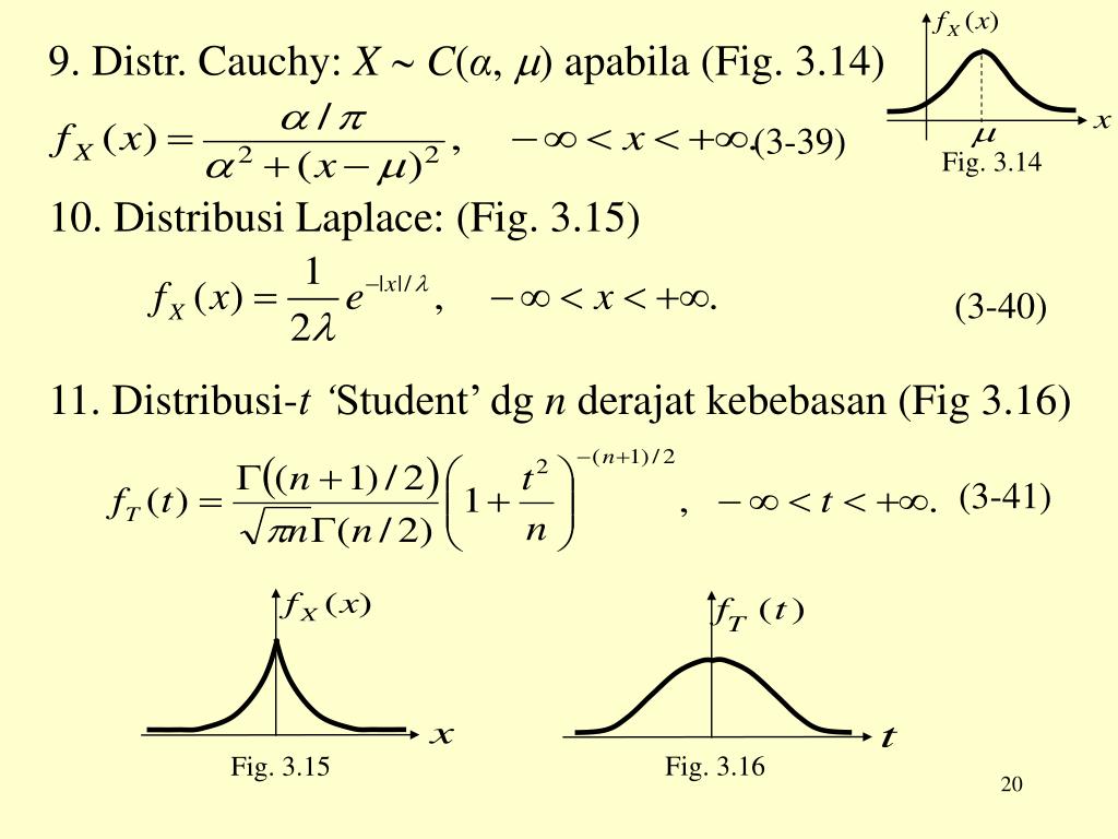 Fig. 3.14 Fig. 3.16 Fig. 3.15 9. Distr. Cauchy: X C(α, ) apabila (Fig. 3.14) 10. Distribusi Laplace: (Fig. 3.15) 11. Distribusi-t ‘Student’ dg n derajat kebebasan (Fig 3.16) (3-39) (3-40) (3-41)